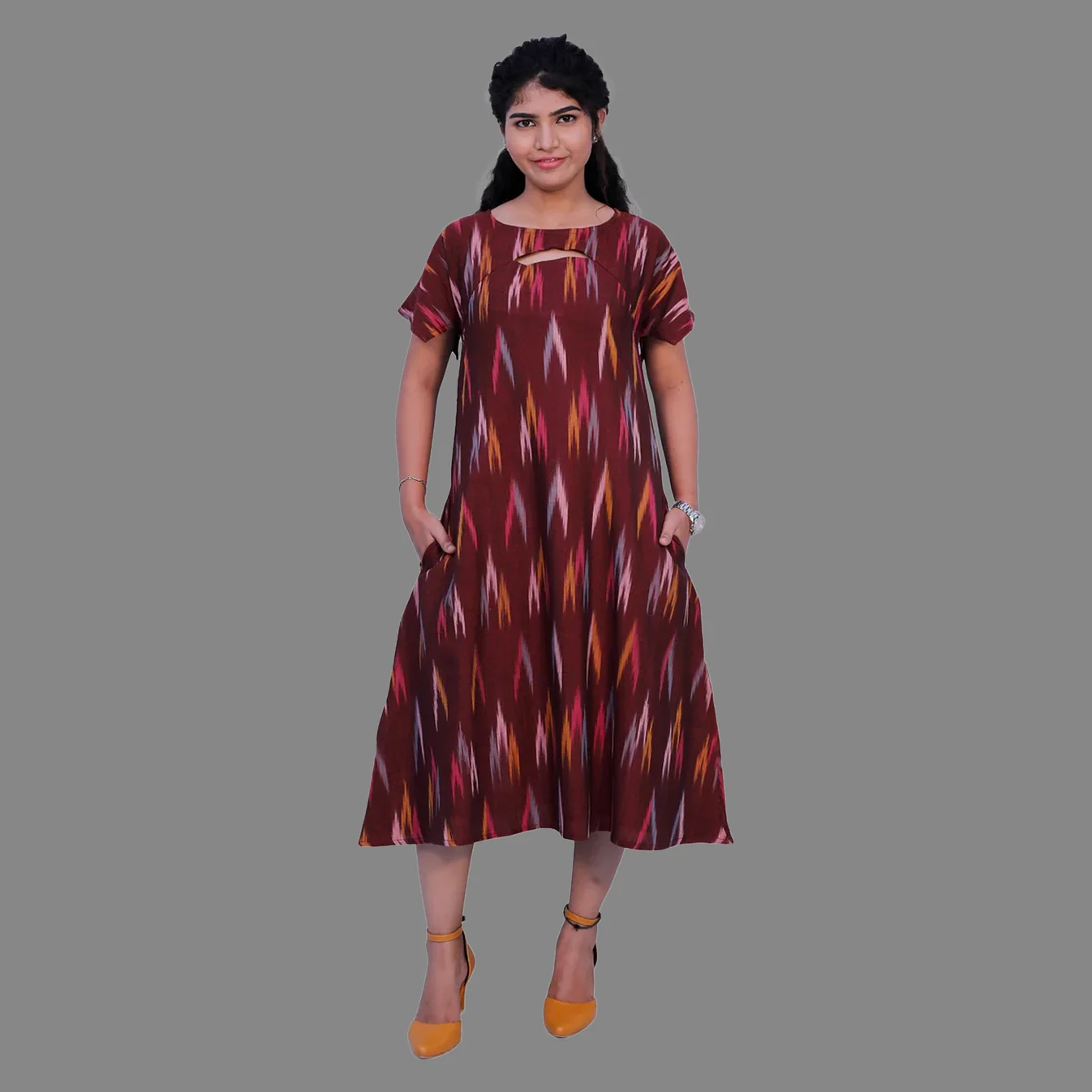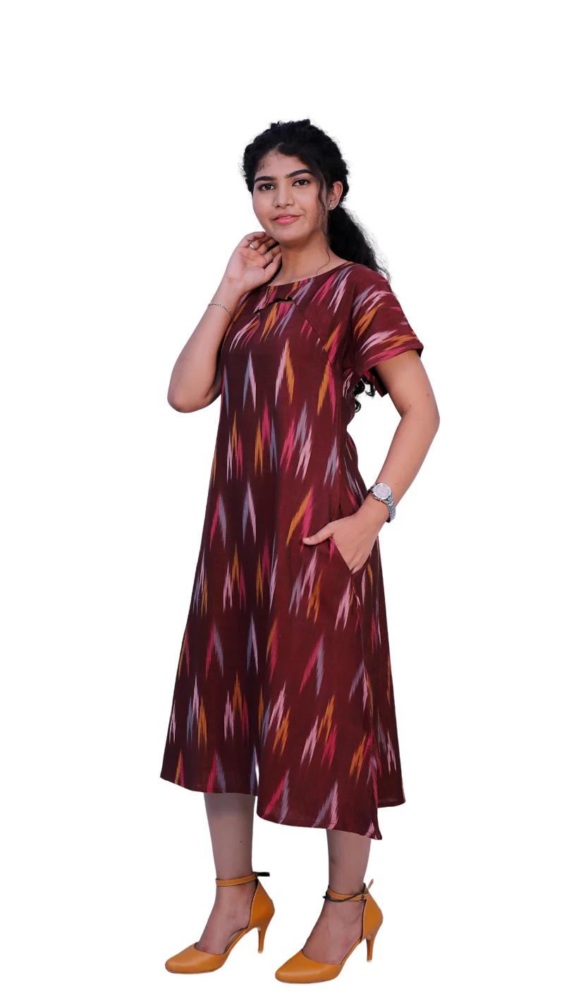 Women’s Maroon Ikkat A-Line Kurta with Pockets – Stylish Comfort in Every Step